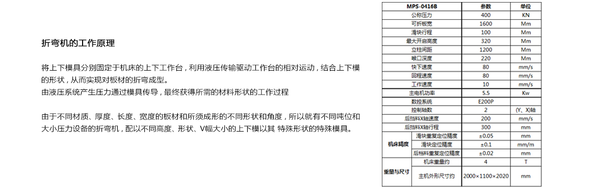 MPS-0416B為2軸集成數(shù)控折彎機(jī) , 采用先進(jìn)的控制系統(tǒng)、進(jìn)口成套液壓系統(tǒng)、機(jī)械液壓同步機(jī)構(gòu) , 運行平穩(wěn)、精度高、噪音低。